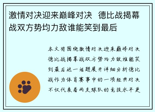 在一场注定载入史册的激烈德比战中,主队与客队展开了一场超越竞技层面的较量。比赛过程中,主队与客队之间的对抗不仅仅局限于球场上的技战术博弈,更多的是展现了两座城市、两支球队背后的文化与激情。无论是战术上的精妙较量,还是球员们一次次的极限突破,都让这场比赛充满了戏剧性。特别是在比赛的最后时刻,客队上演了...